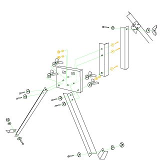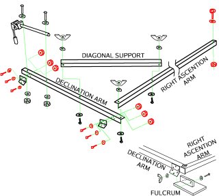 Declination arm: 35"In the blowup diagrams, the following color codes are used for nut, washer, and bolt sets: