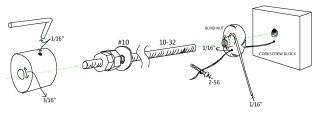 The basis of the corkscrew mechanism was a threaded 10-32 rod. A 10-32 blind nut with the blades pressed flat formed the pinion of the corkscrew. The fishing line was anchored to the blind nut with a 2-56 bolt.