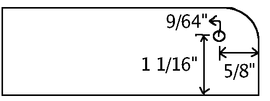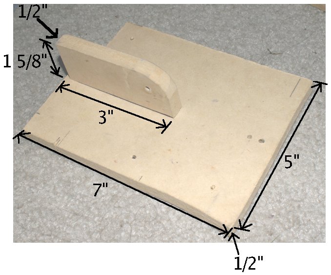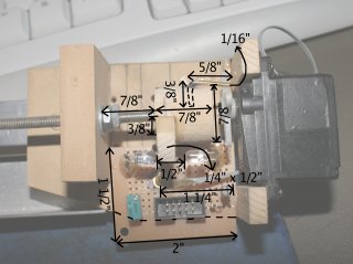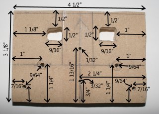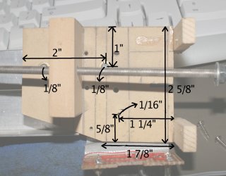 Measurements of holes in the declination adjustment block. The round holes need to line up with pieces of aluminum so they must be drilled through the wood and aluminum in one movement with the aluminum pieces fixed.