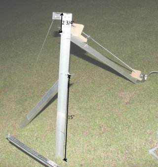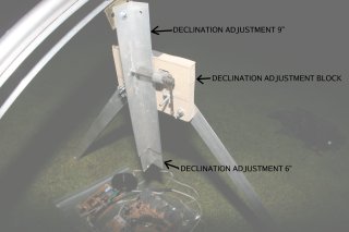 The tripod head was taken from the cheapest available tripod. The tripod head plus 14" of the center rod were cut out of the original tripod. 9/64" holes were drilled through the rod and the declination arm. It was permanently attached with bolts. A more expensive tripod head with pan/tilt worm gears would simplify alignment but defeat the purpose of the trapezoid. We don't recommend ball heads because you need to adjust right ascention independantly of declination to reset.