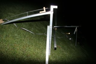 The moving part in a trapezoidian is 2 pieces of aluminum arranged in a right angle. One piece is 5 ft, points east, and is raised to achieve about 15.04° of rotation per hour. This is the rate at which stars track across the sky, not the rate at which the Earth finishes a day. The perpendicular leg is 3 ft, and points exactly on the Earth's axis of rotation.