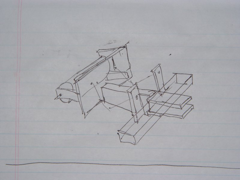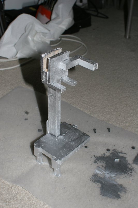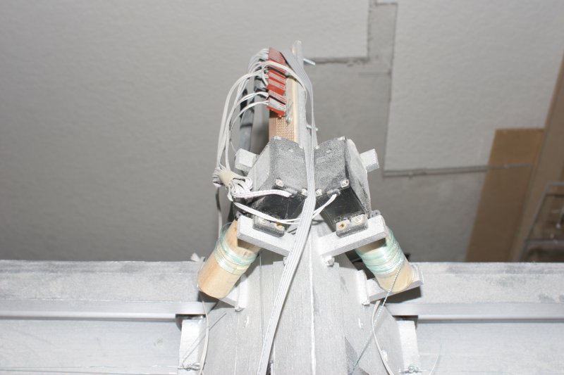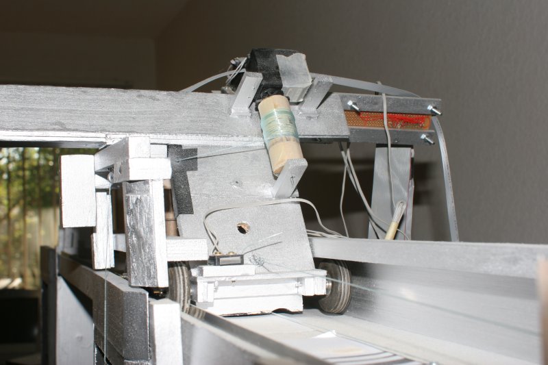The crane was built around a triangular structure. It now contains the servos, an electronics junction, left and right boundary switches, and a barcode scanner.