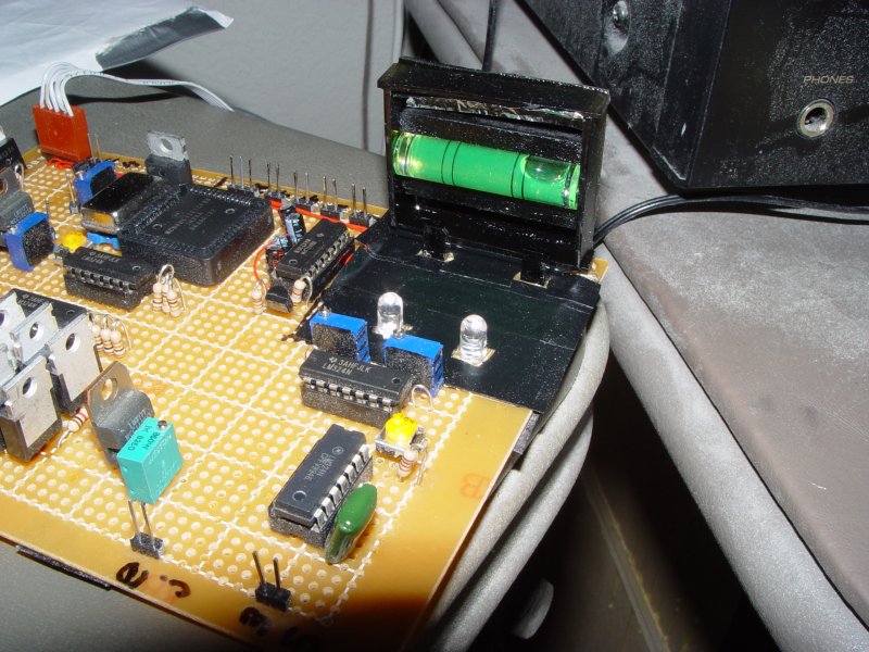 Inside the black box is a balance sensor. Without constant balance readings and adjustments by computer, the sled would tilt and crash into the tower. Being before the age of IC accelerometers, all we had was a bubble level and 2 IR cutoff sensors. The liquid balance sensor has worked well enough that there hasn't been a need to upgrade it.