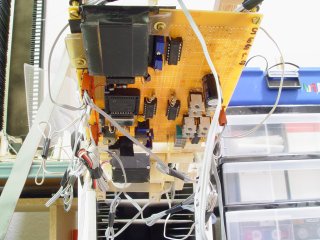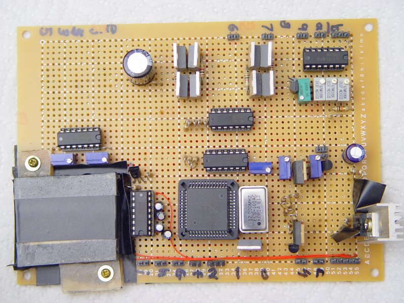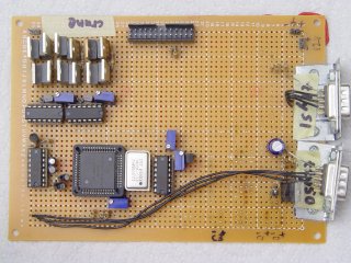 The main board contains 1 Motorola 68HC11E1 MCU for controlling the crane. This was our first and last 68HC11 project since newer PIC 18F microcontrollers are much more powerful.