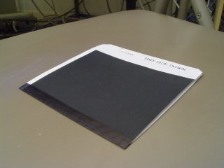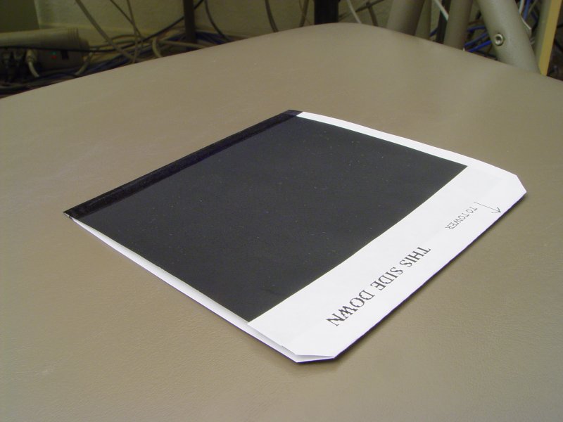 Every detail of the sleave was highly optimized for accesses by the robot and for minimum cost. The corners are beveled to prevent jamming on the tower walls. The paper is colored black to conceil it from the robot's position sensor. The glue flap faces down to prevent jamming of the grabbing mechanism. The paper is folded perpendicular to the direction of motion in and out of the tower to prevent splitting between two rows.