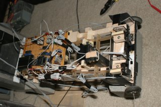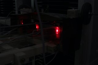 2 laser bounce sensors provide vertical positioning information. The sensor in the middle detects module boundaries. The sensor on the side detects row pieces. They're both mounted on a swivel platform to move out of the way when disks are being changed.