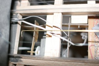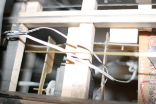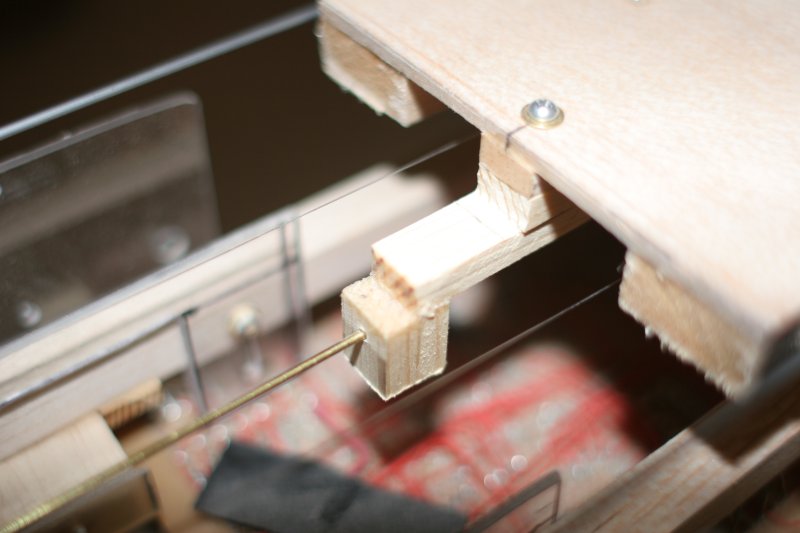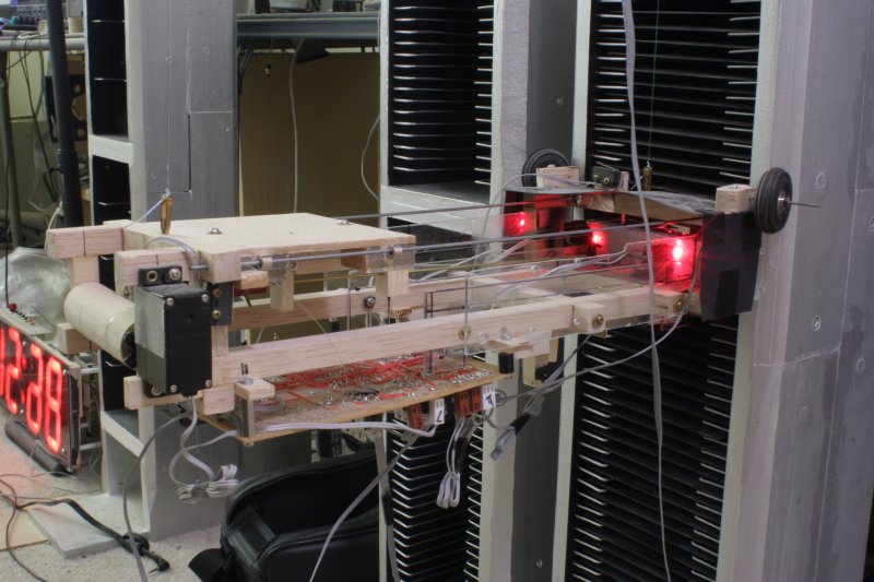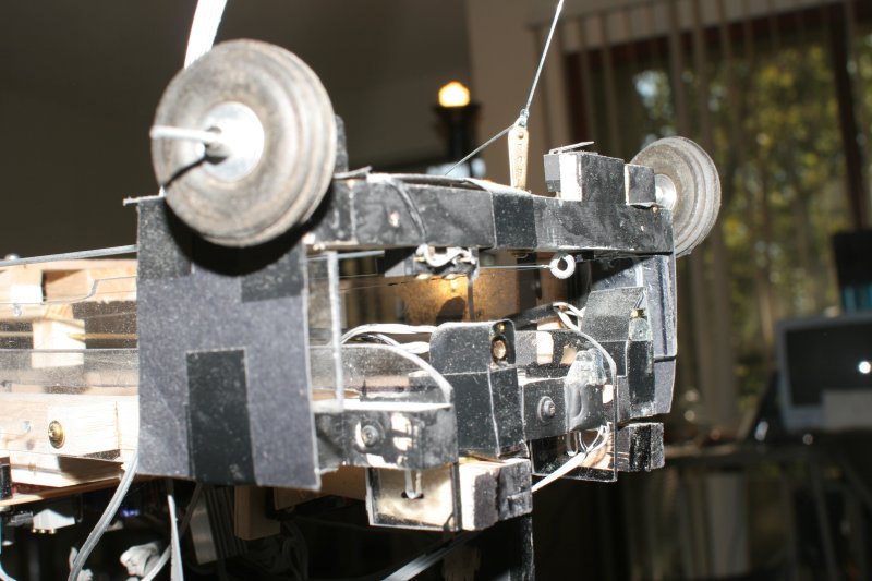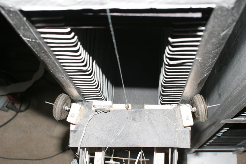 The sled rides on two fat wheels. The giant wheels prevent jamming when moving between the crane and the tower. The wheel guides are bevelled corners. Bevelled corners have no place for the wheel to jam and are the easiest to manufacture.