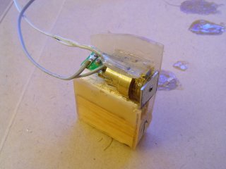Making a vertical sensor begins with encapsulating the photodiode in epoxy. A photodiode, laser pointer, and bolting position are stacked and epoxied together. If anything breaks, the components can still be separated if you're lucky. All lasers have a steel plate glued on to narrow the beam.