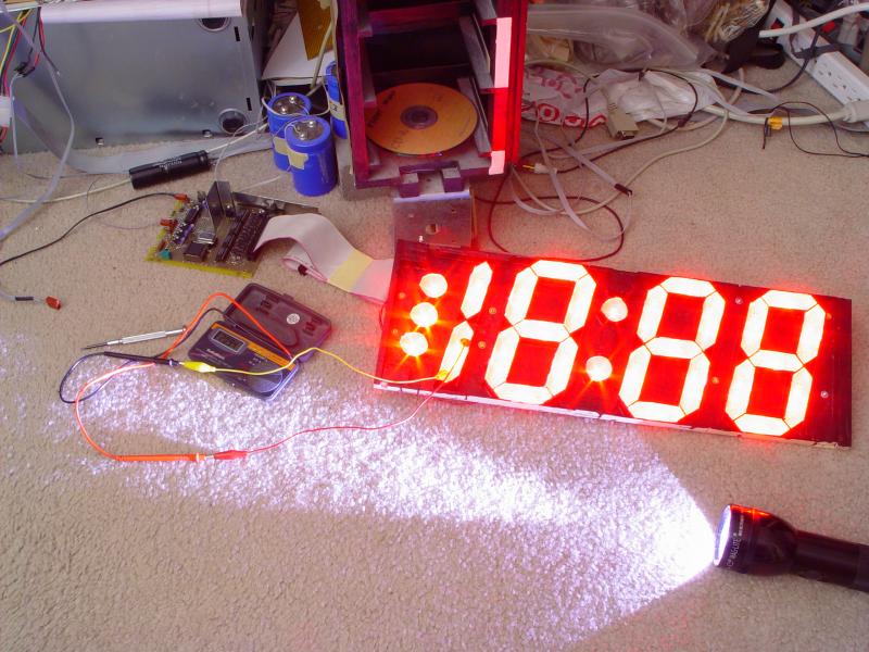 HeroineClock would be perfect if she could run on batteries but a $30 NiCad battery pack would only last 10 minutes. The current power supply is a mess of computer cables, stripped of the fan for silence. It gets real hot. The input voltage was eventually upgraded to 12V. It's so hard to make cheap semiconductors work at lower voltages that 12V has been the most convenient voltage for everything.