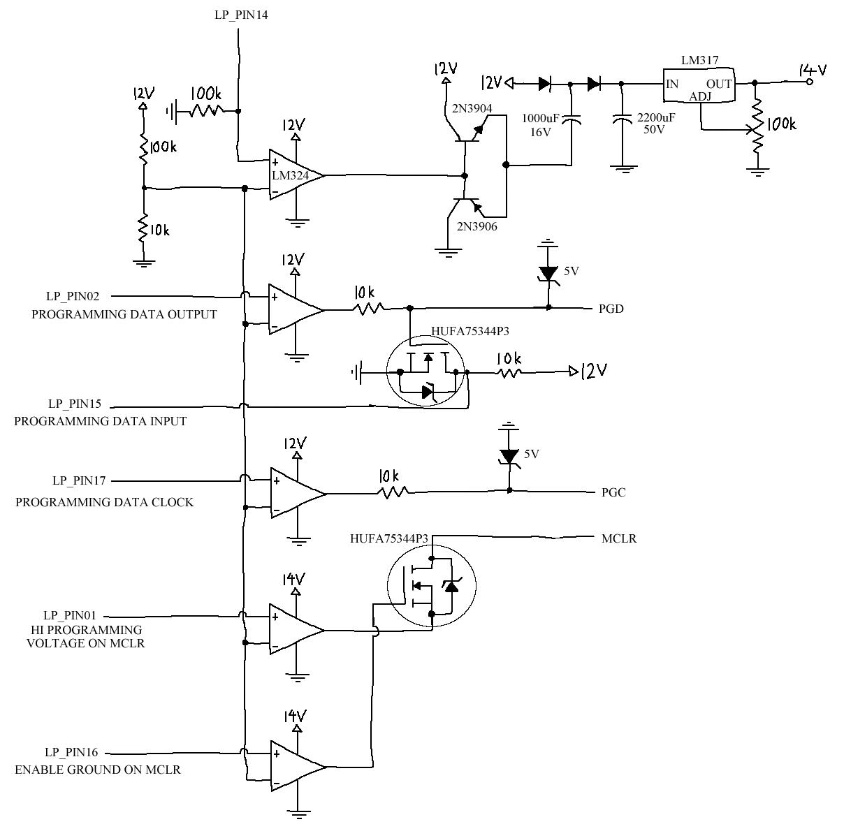 Two capacitors, a complimentary transistor pair, and an op-amp are involved in generating 14V, 5V, and 0V for the reset pin. The 16F87 requires 14V to go into programming mode, 5V to go into runtime mode, and 0V to reset.