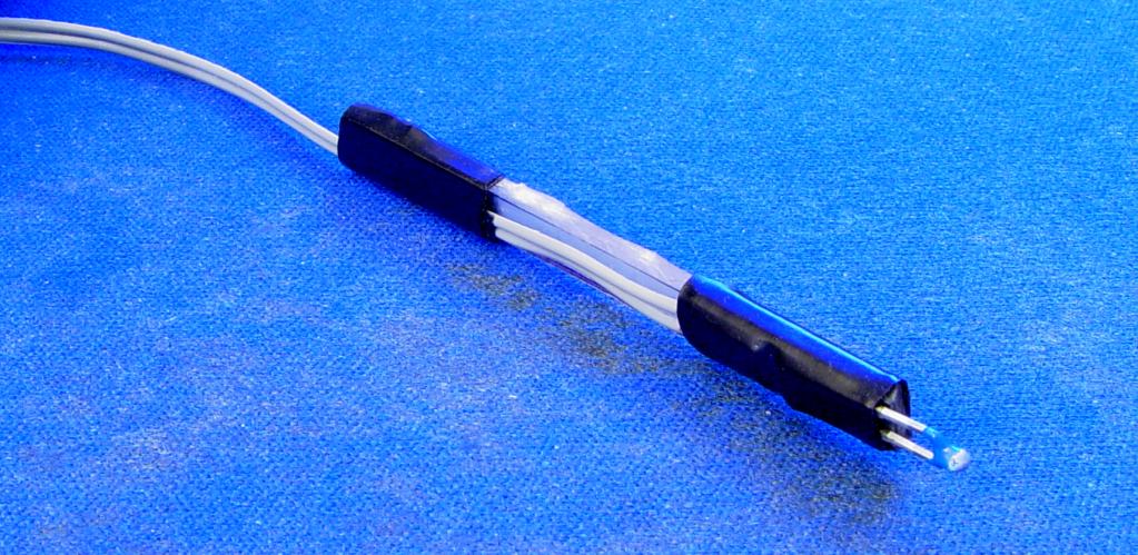 The probe is a bare thermister on a fiberglass rod, allowing it to measure small objects. Used lead-free solder but still wouldn't put it on your mouth. The probe runs between 1k and 20k and the cable has 1 ohm of resistance; nevertheless, the probe still seems susceptible to interference if left near a computer.