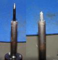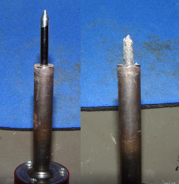 Comparison of a new Weller tip to one which was ground down through many resharpenings until nothing was left. Weller tips seem to melt faster than Archer tips, but Archer tips are no longer sold. Weller tips have a thin laminate of steel over a copper core. After a few minutes the laminate wears out and they melt down in a matter of days. These tips are $2.50 a piece.