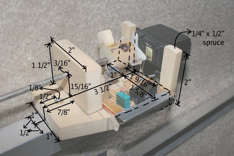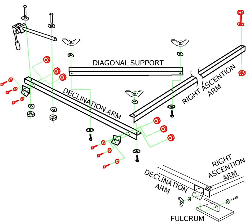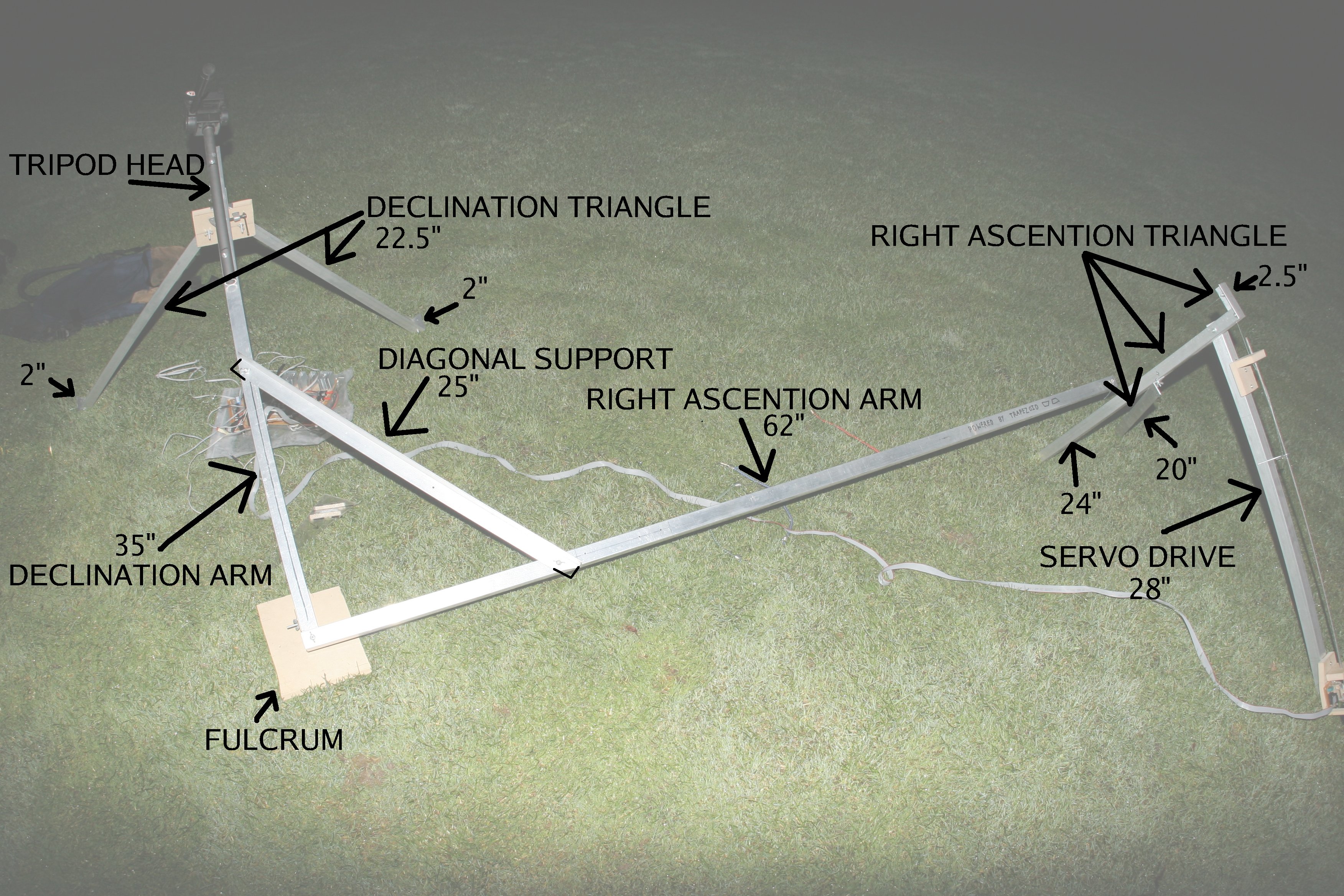 Right ascention arm: 62" Diagonal support: 25" Declination triangle: 22.5" * 2 , 2" * 2 Declination adjustment: 9" , 6" Right ascention triangle: 20" , 24" , 2.5" Servo drive: 28"Only one length of 1/8" angle aluminum is used: