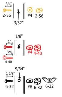 Each bolt has a corresponding hole size. Bolts are cut to the required length + 1/8" when assembly is finished. Whenever a part must be tightened in the field, a wing nut is used.