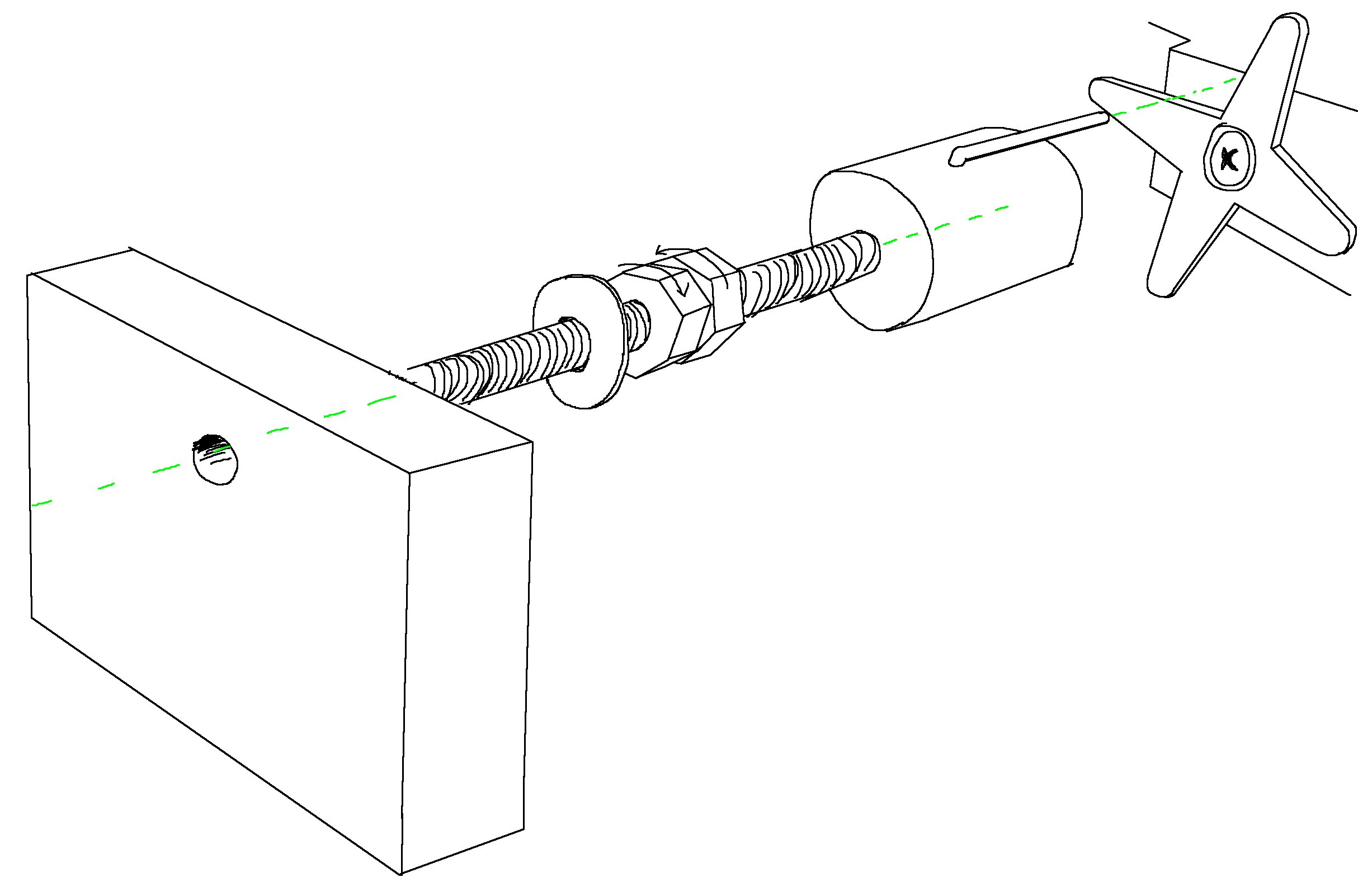 The basis of the corkscrew mechanism was a threaded 10-32 rod. A 10-32 blind nut with the blades pressed flat formed the pinion of the corkscrew. The fishing line was anchored to the blind nut with a 2-56 bolt.