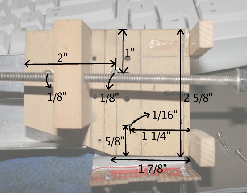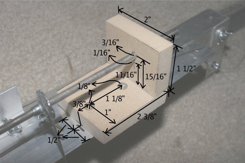 Measurements of holes in the declination adjustment block. The round holes need to line up with pieces of aluminum so they must be drilled through the wood and aluminum in one movement with the aluminum pieces fixed.