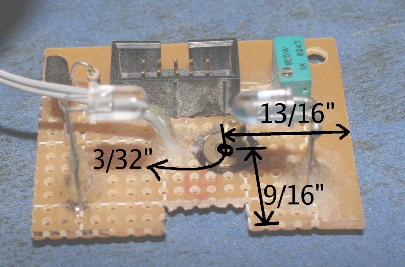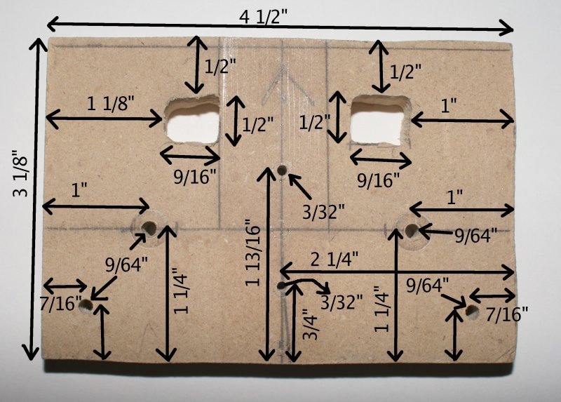Measurements of holes in the declination adjustment aluminum. Only the necessary holes are measured. The other holes were experimental. Unless otherwise noted, holes are roughly equidistant from both sides of the rod. End holes are 1/2" from the end.