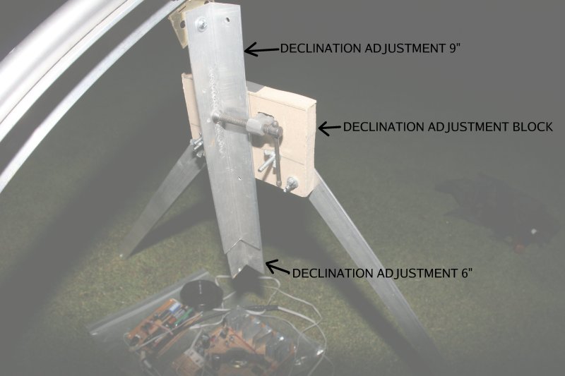 The trapezoidian equatorial mount is fabricated from rods of 1" angle aluminum 1/16" thick and 1/8" thick.