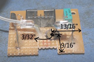 A 1/16" steel rod long enough to reach from the blind nut to hit the right edge of the aluminum was bent around the blind nut and soldered in place. This rod had to be angled such that the 1/16" holes lined up exactly when the 1/16" rod was pressed against the aluminum.